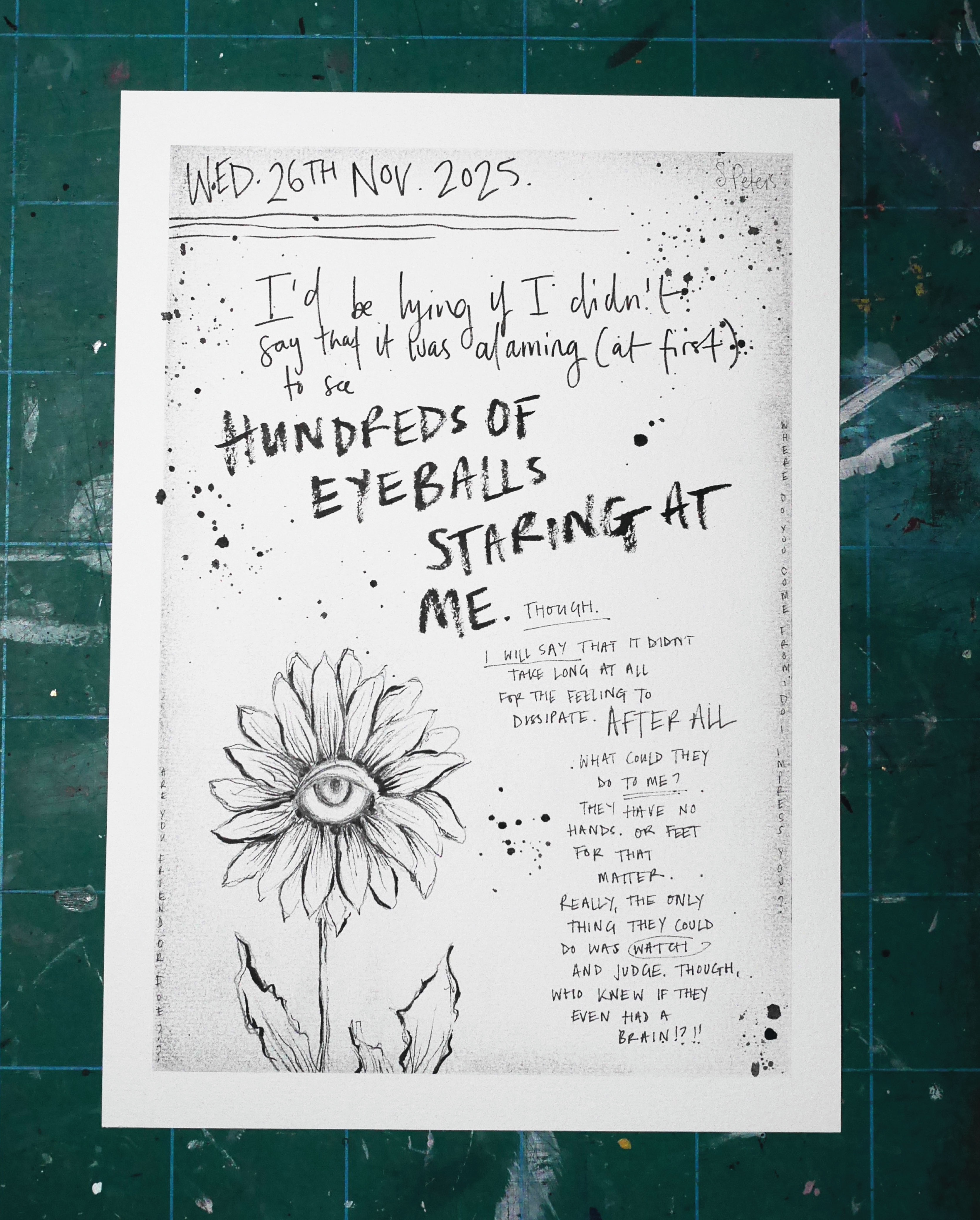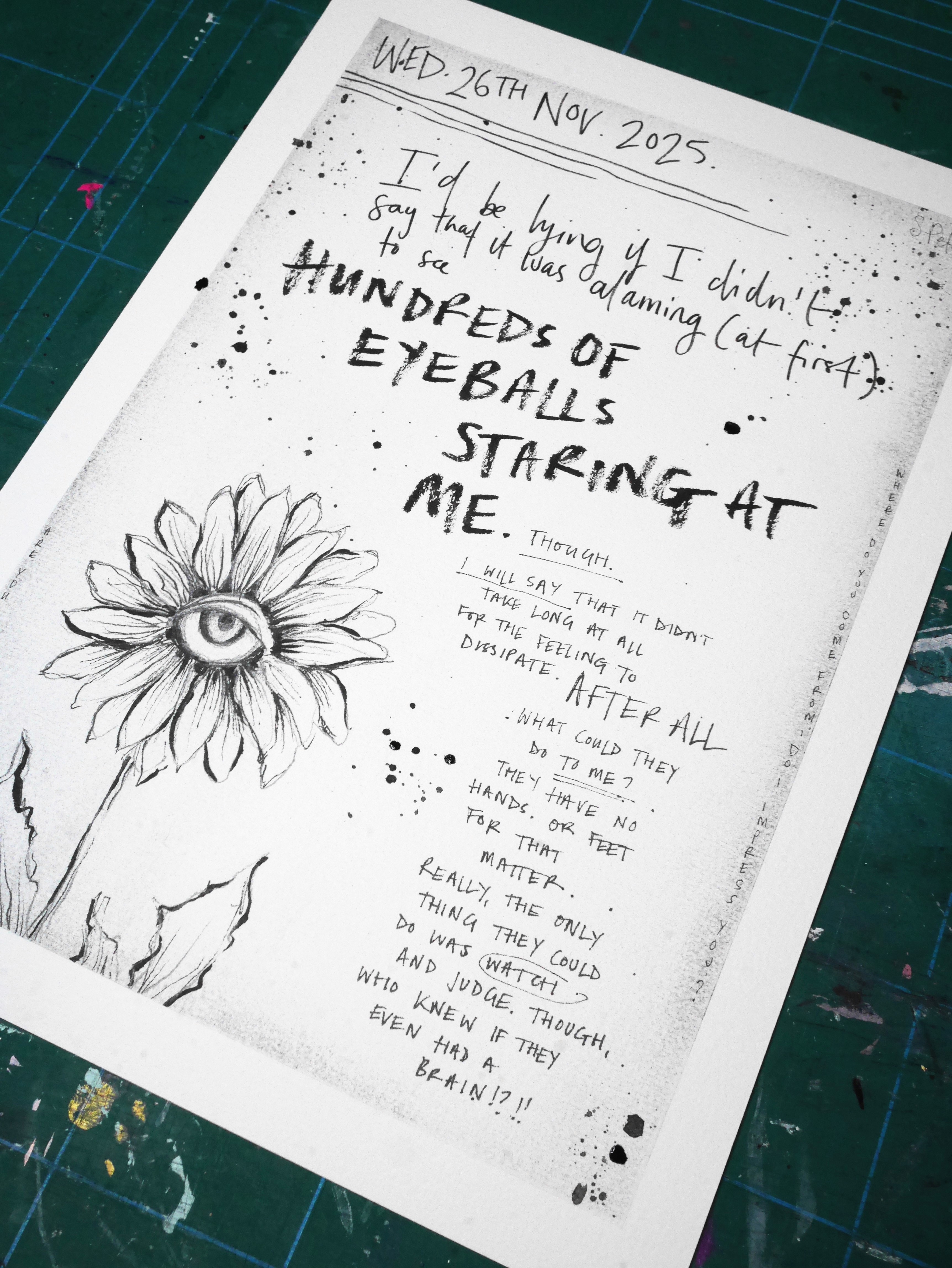 Each piece begins after a short meditation, allowing the mind to clear before ink meets paper. What follows is spontaneous and unfiltered – part letter, part sketch, part confession. The work captures a fleeting moment of emotion, curiosity, or reflection, preserving it in its rawest form.